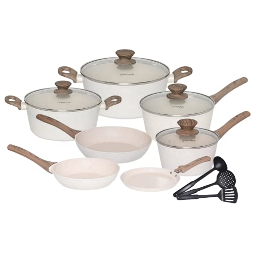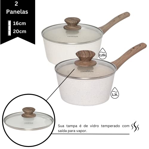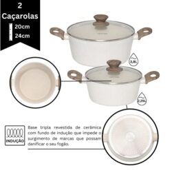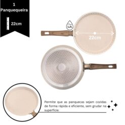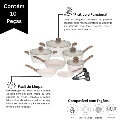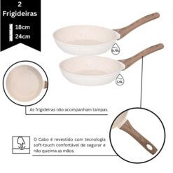 - COMPOSIO: O conjunto composto por duas panelas com tampa, duas caarolas com tampa, duas frigideiras sem tampa, uma panquequeira, uma esptula vazada, uma concha e uma escumadeira. Sua tampa de vidro temperado com sada para vapor, e sua ala revestida com tecnologia soft-touch confortvel de segurar e no queima as mos. Os utenslios so produzidos em silicone. Abaixo, consulte medidas no campo de descrio do produto
