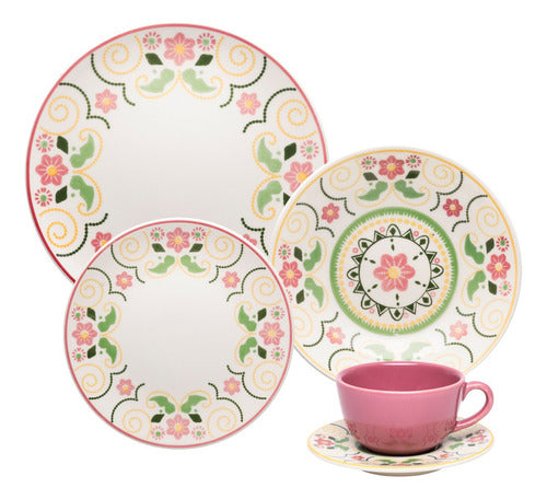 O conjunto possui um material feito de cermica e serve at 4 pessoas. Acompanha 4 pratos rasos de 26 cm, 4 pratos fundos de 22 cm, 4 pratos de sobremesa de 18,5 cm, 4 xcaras de 200 ml e 4 pires de 16,5 cm. Pode ser usado em mesa posta, jantar, almoo, lanche ou no que desejar, pois combina com qualquer momento especial e feliz.